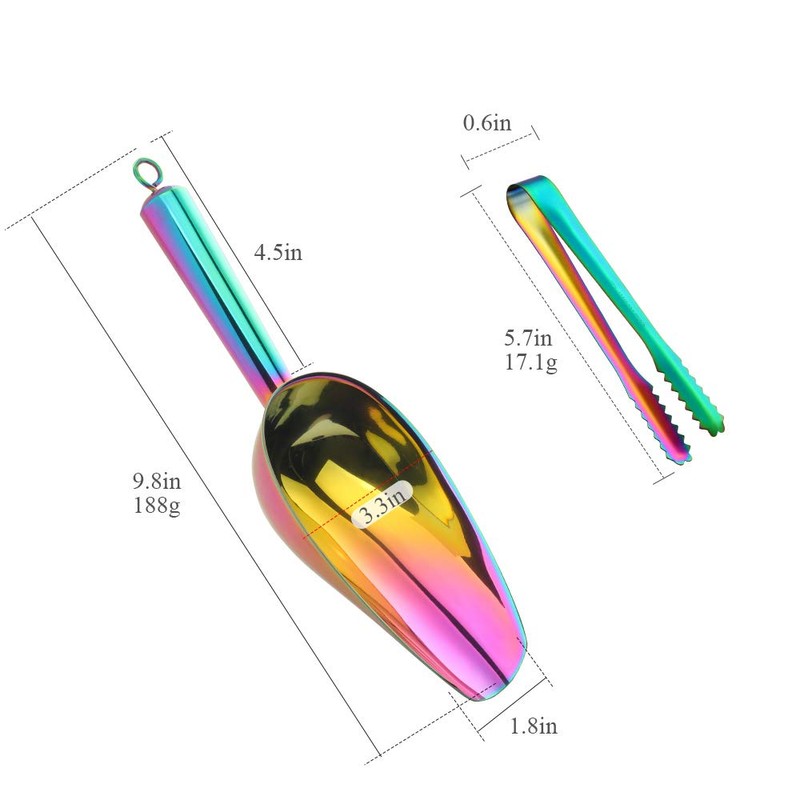 **Specification** Color: Rainbow Material: Premium 304 Stainless steel Package includes: 2x 6" ice tongs, 1x 10" Ice Scoop Dishwasher Safe: Yes **Smooth surface** These ice tongs and ice scoop are made of quality stainless steel, polished design make the surface is smooth and comfortable to grip. And they are easy to clean and dishwasher safe. **Delicate design** Ice Tongs with the teeth on the side of the tongs, you can easily grip up ice firmly. Great Gift for any Home Bar Enthusiast **Note & Maintaince** Easy to clean it just run the dishwasher it. Is not easily rusted or had any other problems Recommended to hand wash for a long time last using Dont put them into microwave because of the stainless steel material **Mingcheng offers high quality stainless steel cutlery, all of our products have pass the FDA, LFGB and EU Food Safe Test. Any questions please feel free to contact us!**