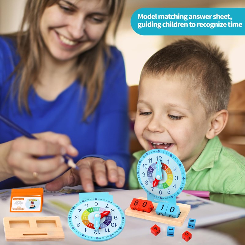- Educational clock set: contains forty time answer cards, 4 cubes. A base and a dial. The watch model with the time response cards can help children recognise the time, read watches and develop the concept of time.
