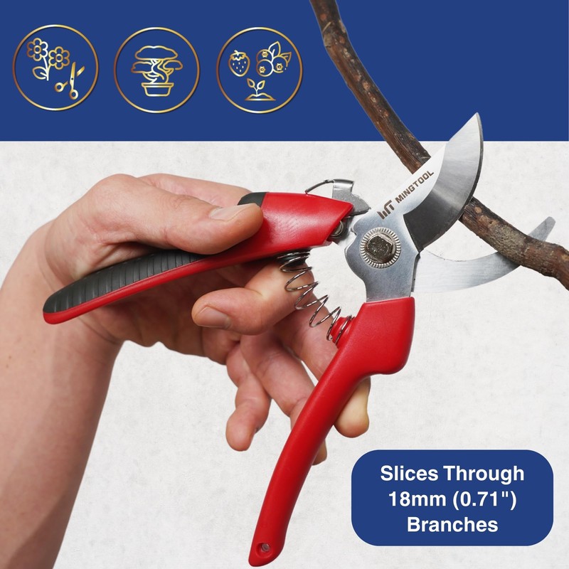 - MAXIMUM POWER AND PRECISION: Easily trims branches up to 0.71 inches in diameter, suitable for various plant pruning tasks. MINGTOOL's pruning shears with low-friction blade coating makes smooth cuts, reduces gumming, and enhances rust resistance; the hand pruners with steel blades stay sharp through heavy use and provide excellent durability