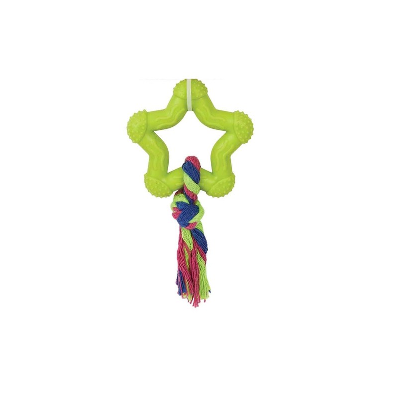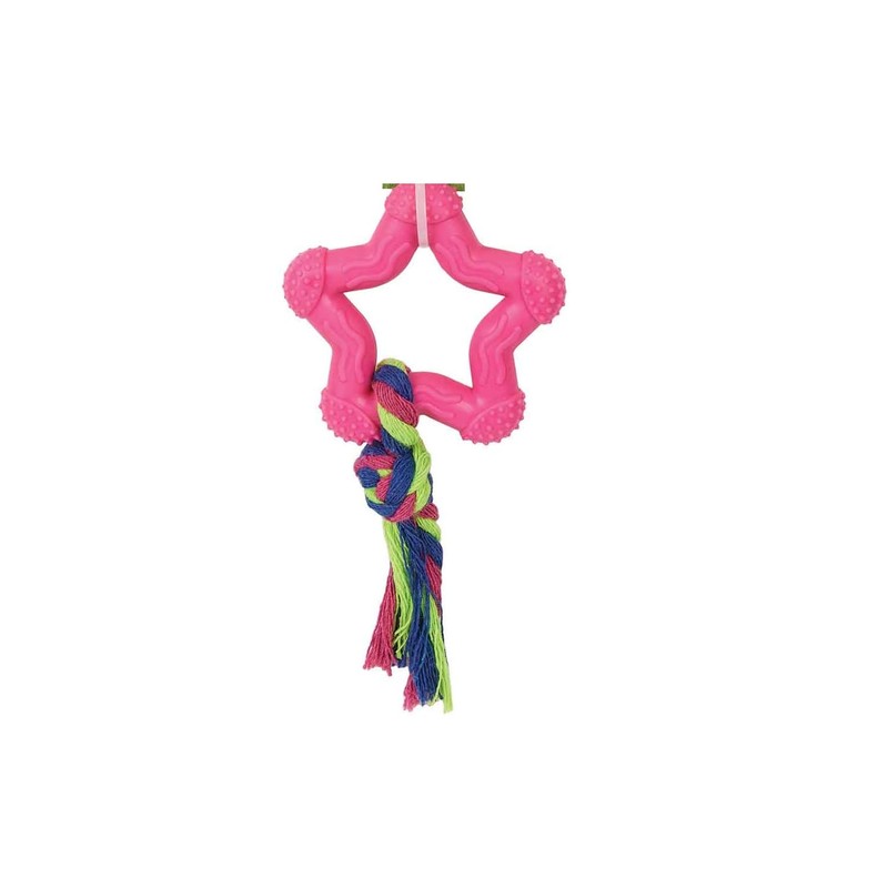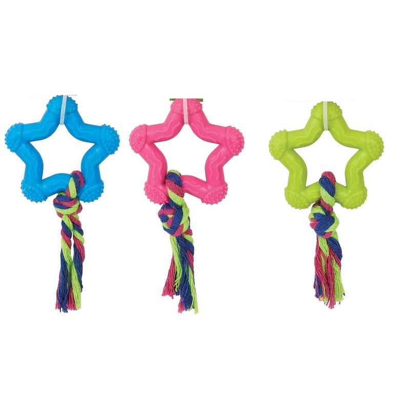 Great for chewing with their textured knobby star and little rope. Promotes good dental health as durable rubber nubs clean teeth and massage gums and cotton rope flosses teeth. Perfect size for smaller dogs and puppies. Rope & star encourage tugging play together Chewing promotes good dental health Flexible and withstands tough tugging Sized perfect for smaller breeds and puppies Colors: Blue, Green, Pink or a Full Set of All 3 Colors! Size: 6" Materials: Rubber; cotton rope