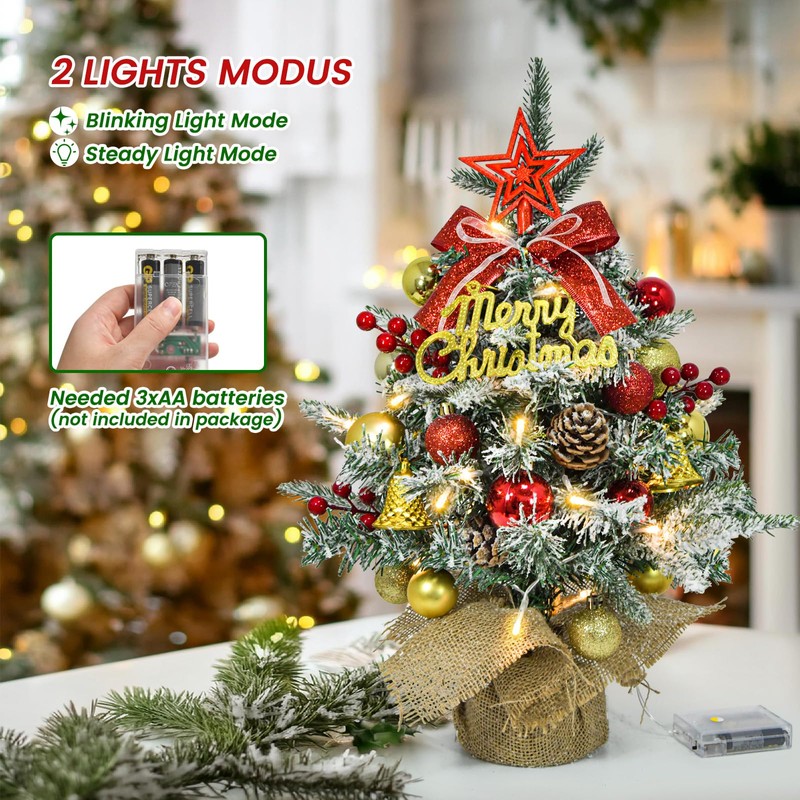 Mini Artificial Christmas Tree with LED, 45 cm Small Christmas Tree Decorated with Artificial Snow and Ornaments, Mini Christmas Tree for Christmas Decoration (Red Silver Gold)