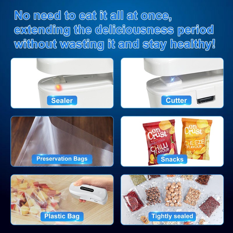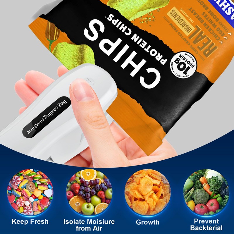 - 【Locks in Freshness, Prevents Waste】 Reseal opened snack bags, chip bags, and dry food pouches by this mini bag sealer to maintain freshness and crispness while reducing unnecessary waste. Keep your food protected from air and moisture.