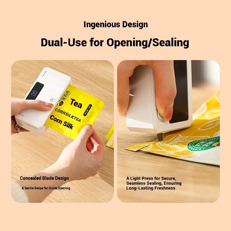 Keep your food fresh and reduce waste with the Mini Bag Sealer Heat Seal Machine – the ideal companion for your kitchen, travel, and on-the-go sealing needs. This compact, portable sealer is designed for versatile use, making it perfect for parents sealing snacks for their kids or individuals looking to preserve food freshness while traveling. With 5 adjustable sealing modes, it efficiently seals bags of varying thickness, including plastic bags, chip bags, and food storage bags, providing consistent and reliable sealing across different materials. Equipped with a 3000mAh USB rechargeable battery, this sealer offers extended usage on a single charge, ensuring you can seal bags anywhere without worrying about running out of power. Its unique magnetic attachment allows for convenient storage by attaching it to the refrigerator or any metal surface. Additionally, the hanging ring design offers an alternative storage option, allowing it to be hung on kitchen walls or other storage areas to save space. The sealer also features a retractable blade and a digital display screen, allowing users to view real-time battery levels and select the desired sealing mode with ease. This 2-in-1 sealer and cutter simplifies food storage, ensuring food stays fresh and flavorful, and reducing waste in your home. Whether you're using it in the kitchen, for travel, or to reseal your kids’ snack bags, the Mini Bag Sealer Heat Seal Machine delivers efficient and reliable performance. Its optimized sealing power, portable design, and durable build make it the go-to solution for all your sealing needs. Key Features: 5 Adjustable Sealing Modes: Suitable for bags of different thicknesses, perfect for daily food storage and travel use. 3000mAh Rechargeable Battery: USB charging interface for long-lasting usage after a single charge. Magnetic & Hanging Design: Easy storage options with a magnetic attachment and a hanging ring, saving space. Digital Display: Real-time battery level and adjustable sealing modes for user-friendly operation. 2-in-1 Sealing and Cutting: Ideal for home and travel sealing of various bags.