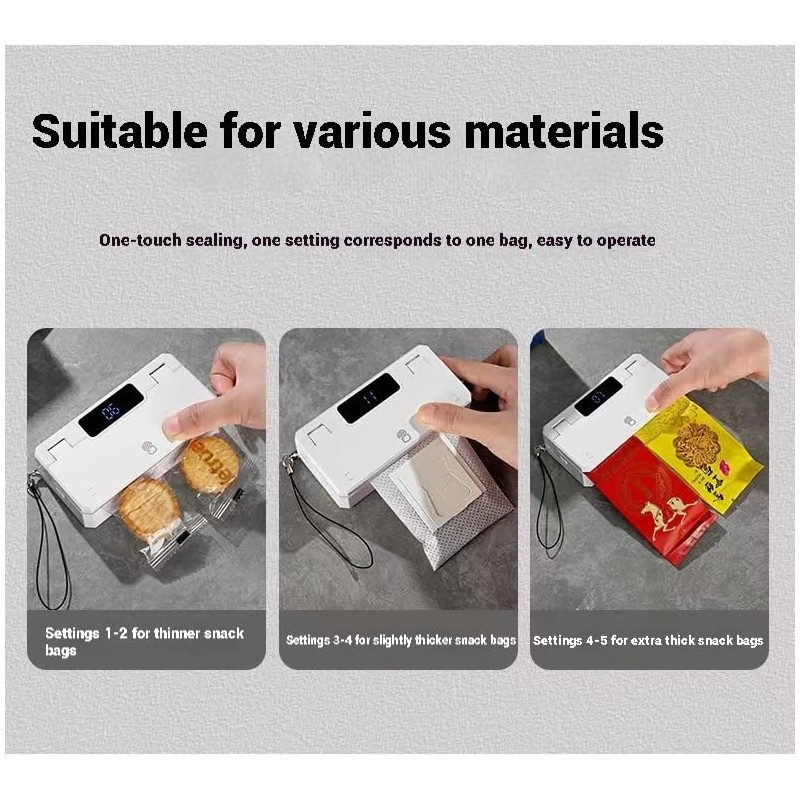 • [Mini Sealer with LED Display for Precise Control]: This portable chip bag sealer features an LED display that shows battery percentage, sealing modes, and a countdown timer, allowing you to choose from 5 seal time modes (P1-P5) based on bag thickness. No preheating is required—simply place the bag under the sealer and press firmly until the countdown (2-12 seconds) completes, ensuring a secure and consistent seal every time. This user-friendly design saves time and is ideal for sealing kids’ snacks, travel food, and kitchen storage bags.