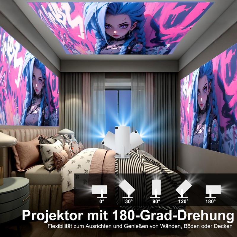 - 【Android 11 & 200'' Riesiger Bildschirm】Dieser Mini Projektor mit Android 11 ermöglicht nutzerfreundlichen Zugang zu einer Vielzahl von Inhalten direkt vom Gerät, ohne externe Gadgets. Filme, Shows, Spiele und mehr können mühelos gestreamt werden. Die neuesten Updates garantieren langfristige Kompatibilität und verbessern Ihr Unterhaltungserlebnis. Das Highlight ist zweifellos der 200'' Riesenbildschirm für ein immersives Seherlebnis bei Heimkino, Präsentationen, Spielen und Outdoor-Events.Dieser intelligente Projektor hat ein 180 ° drehbares Design und kann den 180 ° geneigten Projektor in alle Richtungen richten