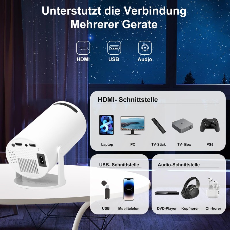 - 【Multi-Geräte-Verbindung und breite Anwendung】 Unser Telefonprojektor ist mit einer HDMI , USB und 3,5 mm Audioschnittstelle ausgestattet, die problemlos mit iPhone/Android-Mobiltelefonen, Tablets/iPads, Laptops, USB-Flash-Laufwerken usw. verbunden werden kann Der Bluetooth-Videoprojektor kann für Heimkino, Videospiele und Partys verwendet werden