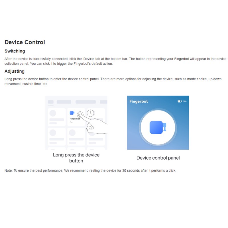 Touch Control: The physical button allows the Fingerbot to be activated without using your phone. Place your finger on the button at least 0.1s. The Fingerbot will be triggered.