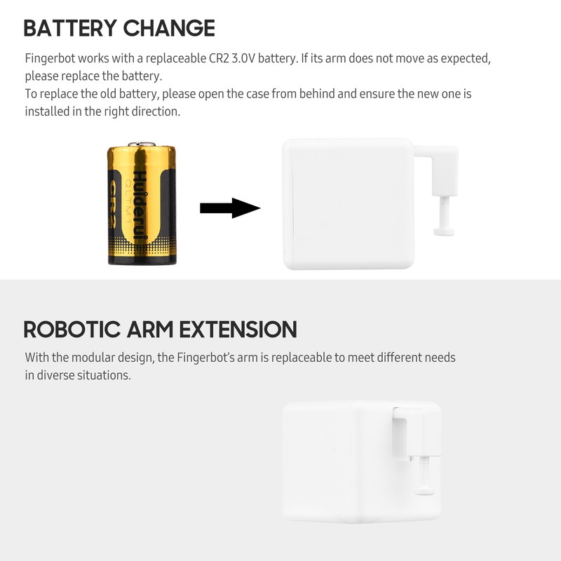 Fingerbot is the world's smallest robot for smartly controlling different types of buttons and switches. It can control your existing home appliances with robotic clicks. Switch lights via app, schedule a morning coffee, activate your vacuum cleaner with voice command, and remotely power on your office PC. Now all these become effortless with Fingerbot.