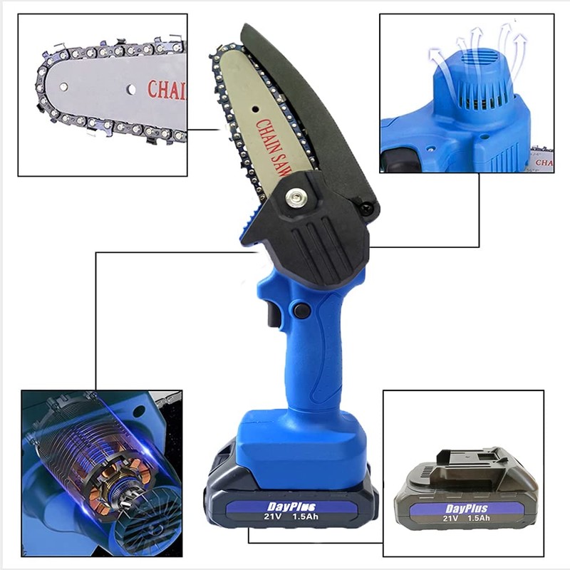 - Chargable: Mini chainsaw cordless is equipped with 1500mAh large rechargeable capacity 21V batteries. Battery chainsaw only takes three hours to fully charge. Saying goodbye to traditional annoying power cord and making sure the working consistence while operating. The cordless chainsaw set offer two chains and 2 pcs of batteries, just want to be your reliable backup.