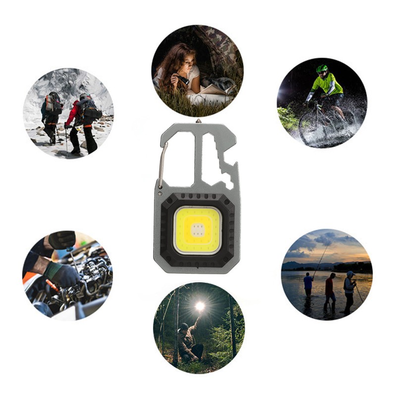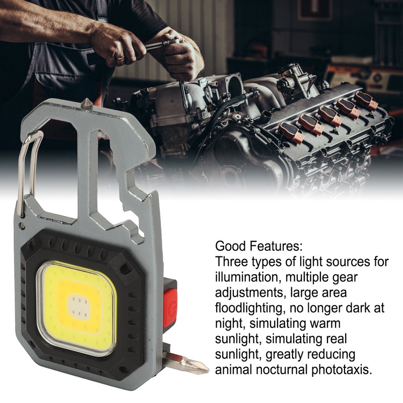 1、Spring Lock Hook and Pen Clip Design: The mini COB work light features a spring lock hook design that can be hung on a backpack or belt buckle. Mini COB work light features a pen clip design that can be attached to items such as clothing pockets, belts, backpacks, etc., making it easy to carry. 2、Good Features: Three types of light sources for illumination, multiple gear adjustments, large area floodlighting, no longer dark at night, simulating warm sunlight, simulating real sunlight, greatly reducing animal nocturnal phototaxis. 3、Bottle Opener and Screwdriver: The bottle opener is made of thickened aluminum alloy material that is durable and does not deform. Equipped with a screwdriver for easy access, with a buckle design that is not easy to fall out. 4、Master Battery Level and Display Battery Level: Rechargeable COB keychain light can display real time battery level, avoiding the embarrassment of suddenly running out of power. 5、1200mAh Battery: Mini COB work light is equipped with a large capacity battery, which meets the requirements of long term lighting, continuous battery life, and always accompanies you. 6、Domestic Waterproofing: Rechargeable mini LED COB work light adopts thickened waterproof sealing ring and circuit insulation design. Even on rainy days, it can't stop your step.