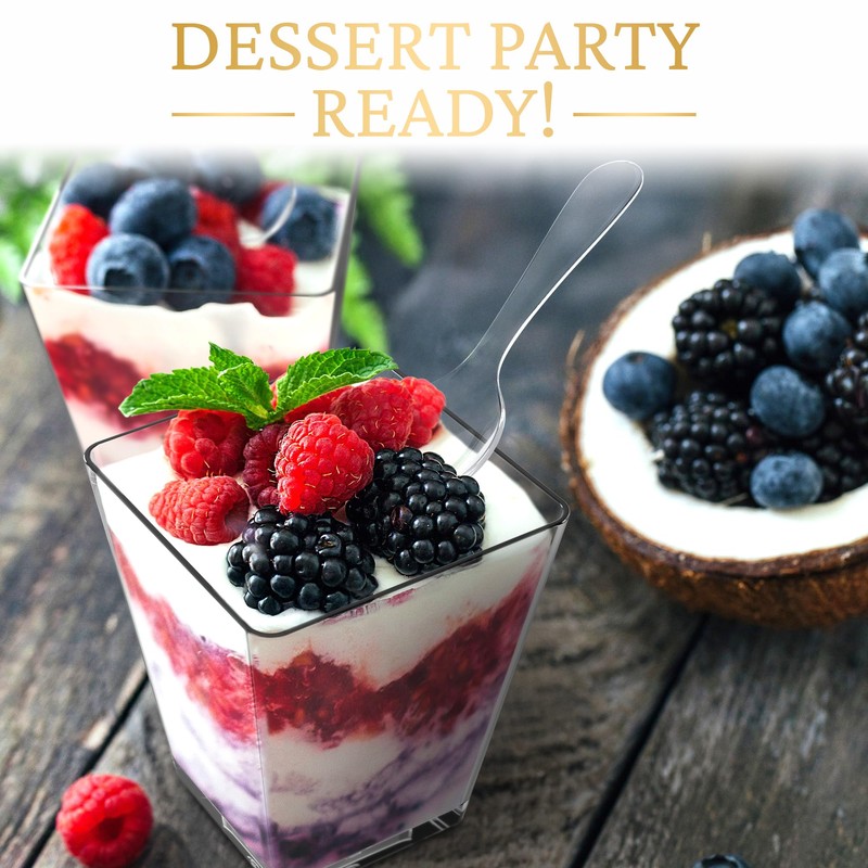 - THE ULTIMATE VALUE PACK that comes with 100 acrylic dessert cups, 100 acrylic lids and 100 golden spoons to serve each and every guest in style. Add to Cart now for a pack of luxury 3 ounce mini trifle cups that’ll blow your guests away!
