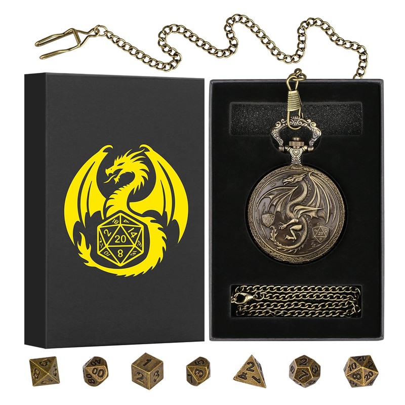 - WINGED FLYING DRAGON DESIGN :This zinc alloy pocket watch case features a carefully crafted winged flying dragon pattern, cleverly redesigned to store your 7 mini polyhedral dice, creating a truly unique and charming storage solution for your gaming essentials.