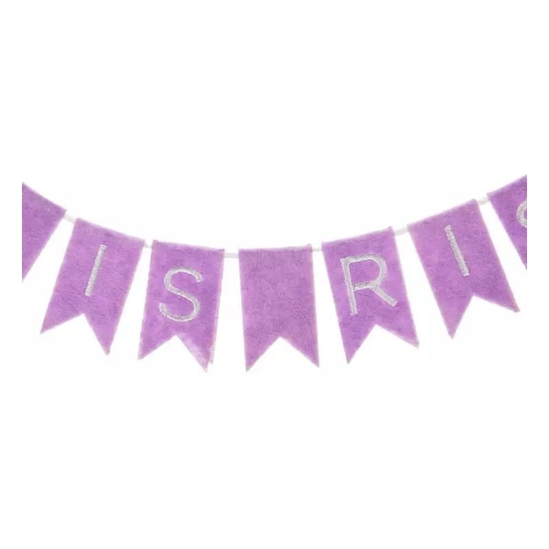- Features felt pennants strung along a braided white string