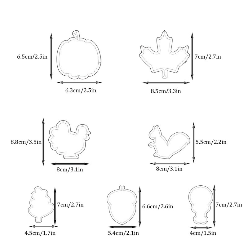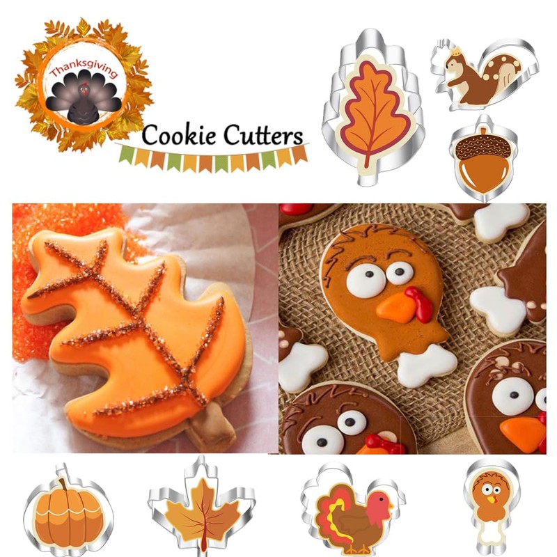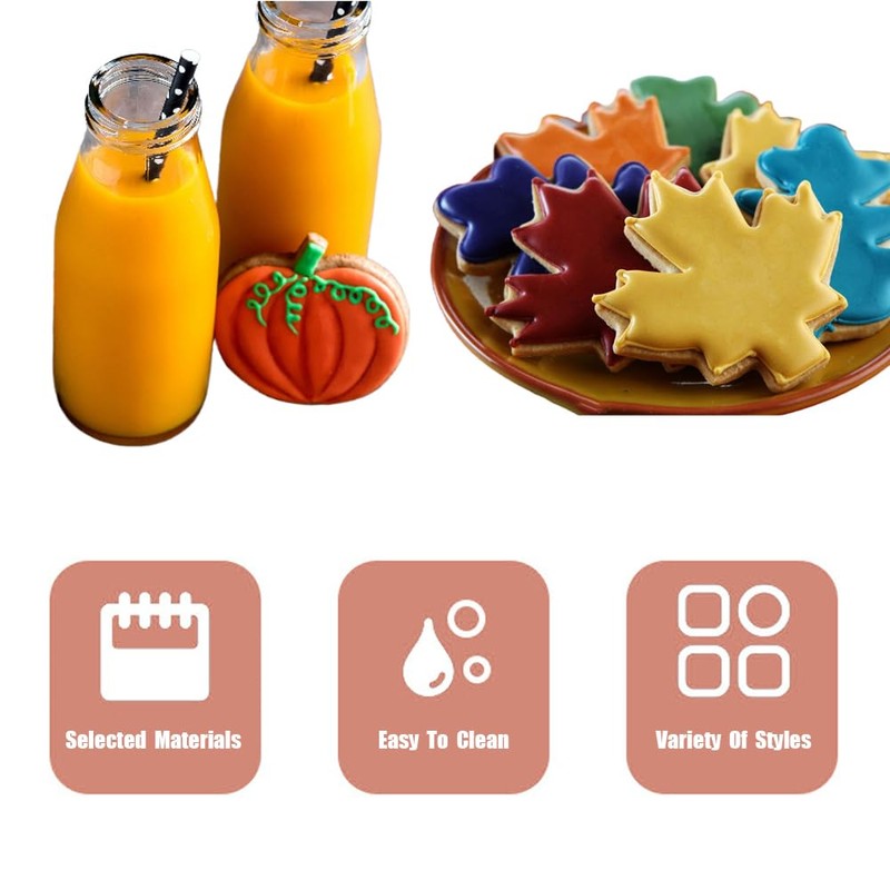 - 【Autumn-Themed Variety】 The set includes seven assorted autumn-themed cookie cutter shapes: Mini Autumn Leaf, Apple, Pumpkin, Acorn, Maple, and Turkey. These shapes are perfect for adding seasonal charm to your baked goods.