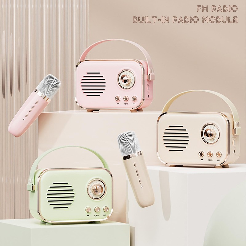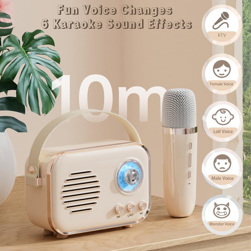 • Kids Karaoke Machine with 2 Microphones: Dive into the joy of duets with the inclusion of two wireless microphones. Double Mics, Double Fun. Suitable for various apps and devices. Speaker with microphone , little vintage karaoke set cute design. This karokee machine with bluetooth and wireless microphone uses square design and blends modern technology with retro classic aesthetics.