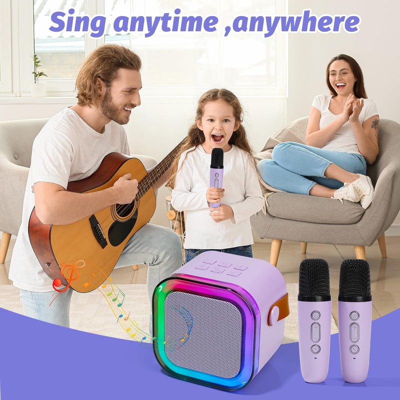Mini Karaoke Speaker with 2 Wireless Microphones,Voice Effects,LED Lights, Portable Singing Machine for Girl, Ages 3,4,5,6,7,8,9,10,11,12+ Years Old Girl Birthday Gift, Karaoke Machine (Purple)
