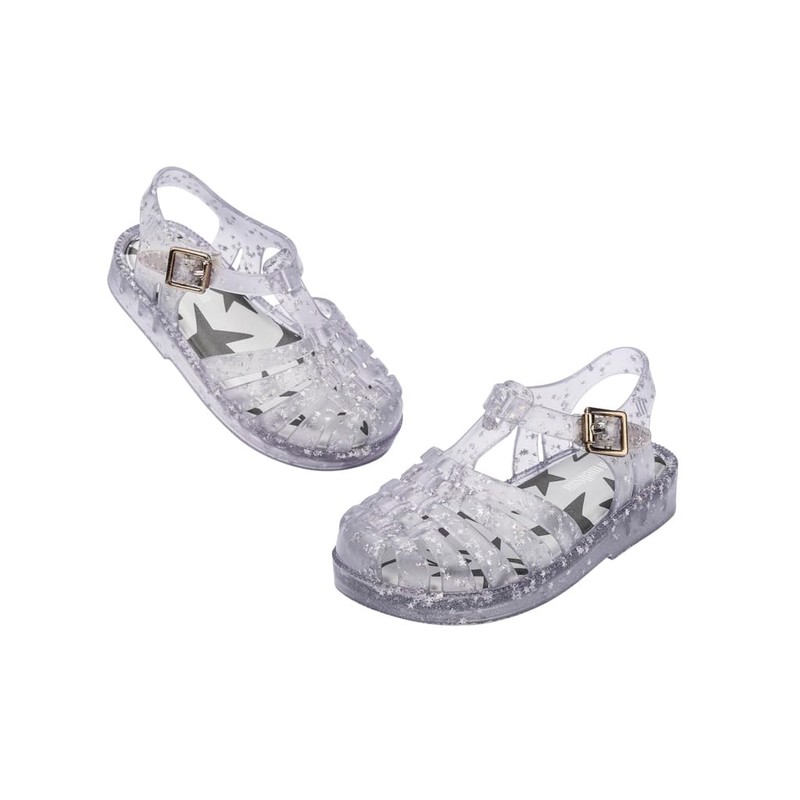 mini melissa Possession Shiny Jelly Sandal for Babies & Toddlers - The Iconic 90s Original Jelly Shoe, Fishermans Sandal with Adjustable Strap & Side Buckle, Glitter Clear, 8