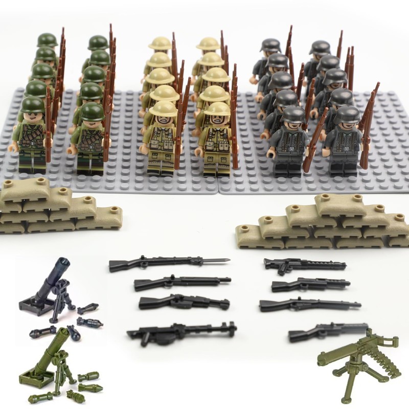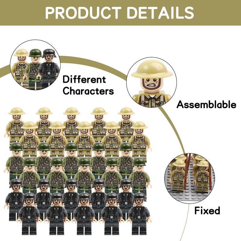- Detailed soldier design: the mini military soldier models feature detailed soldier figures inspired by World War II equipment. Each WWII figures playset displays precise military equipment that increases realism for both the game and display.