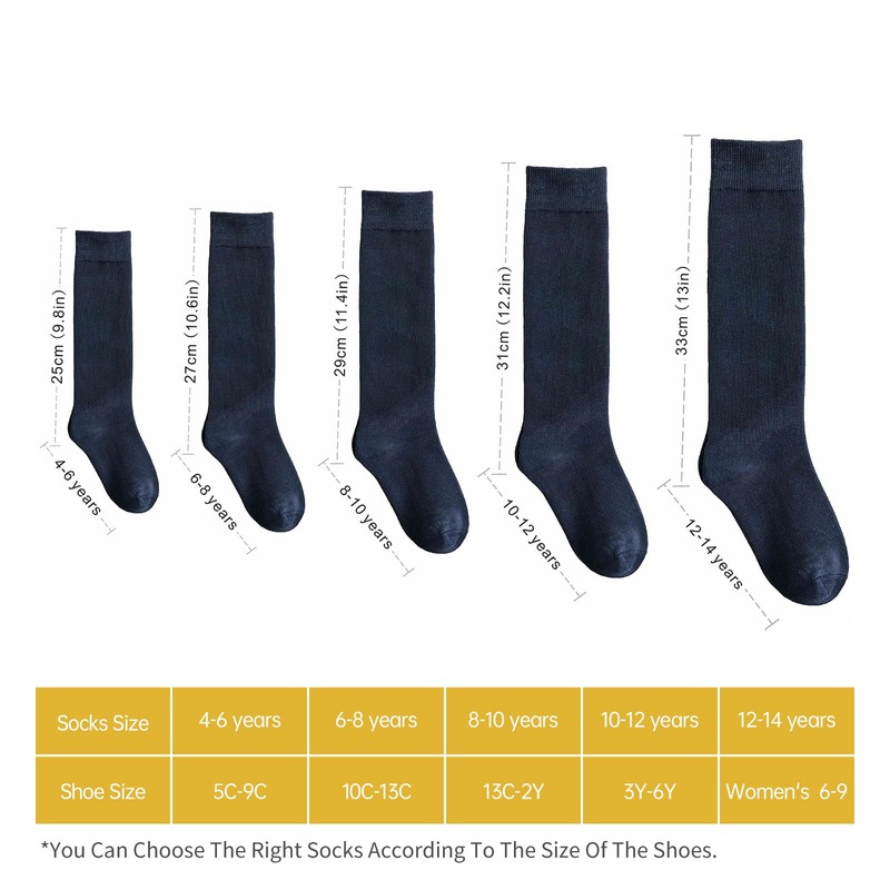 - Calcetines altos hasta la rodilla para niñas, la talla correspondiente a la talla del zapato es de 4-6 años (5C-9C) de 6-8 años (10C-13C) de 8-10 años (13C-2Y) de 10-12 años (3Y-6Y) de 12-14 años (6Y o más, el tamaño de zapato para adultos 7-10 también está disponible)