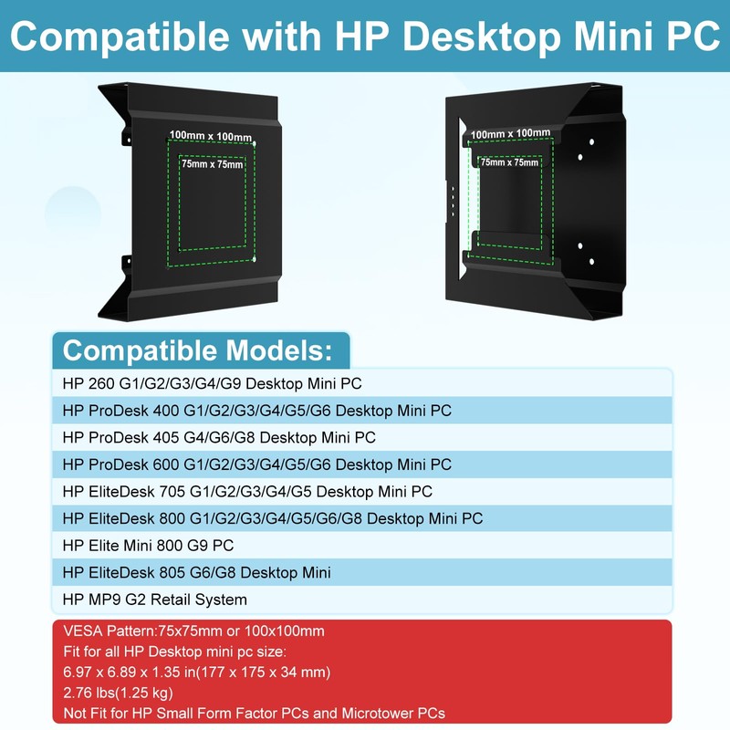 - ---Compatibility---The mount for HP 260 G1/G2/G3/G4 Desktop Mini PC,HP Pro Mini 260 G9 Desktop PC, HP ProDesk 400 G1/G2/G3/G4/G5/G6 Desktop Mini PC, HP Pro Mini 400 G9 Desktop PC, HP ProDesk 405 G4/G6 Desktop Mini PC, HP ProDesk 600 G1/G2/G3/G4/G5/G6 Desktop Mini PC, HP Elite Mini 600 G9 PC, HP EliteDesk 705 G1/G2/G3/G4/G5 Desktop Mini PC, HP EliteDesk 800 G1/G2/G3/G4/G5/G6/G8 Desktop Mini PC, HP Elite Mini 800 G9 PC, HP EliteDesk 805 G6/G8 Desktop Mini, HP MP9 G2 Retail System
