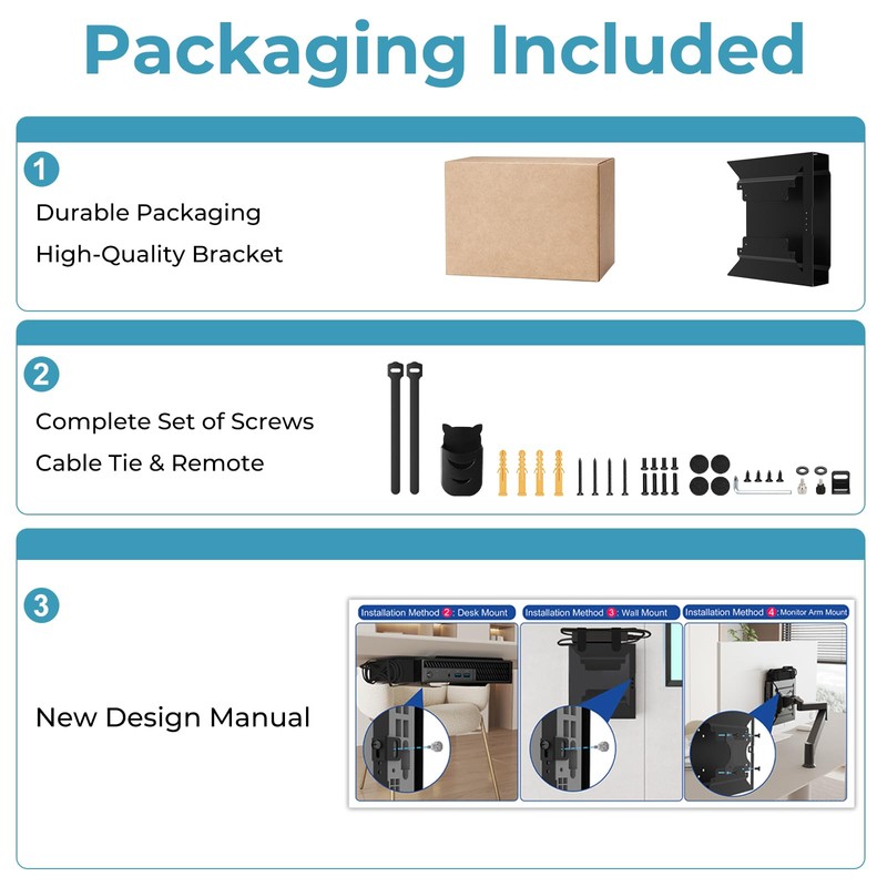 - ---Four Mounting Options---Mount your device under the desk, under wall, behind a monitor, or attach it to a monitor arm, Enjoy a clutter-free workspace with flexible placement choices.(Note: Monitor arm not included.)