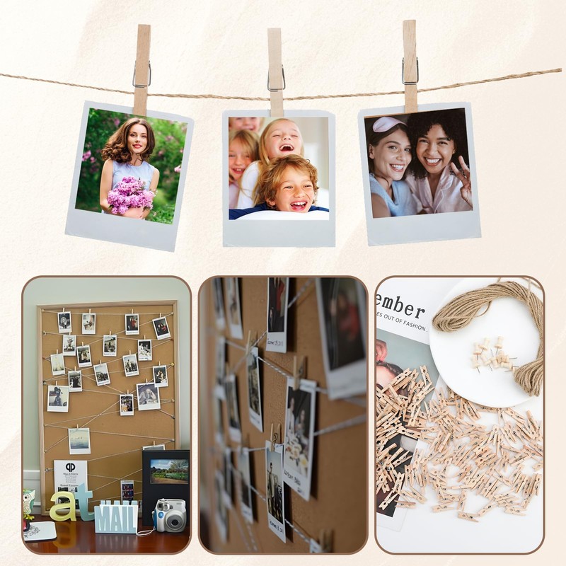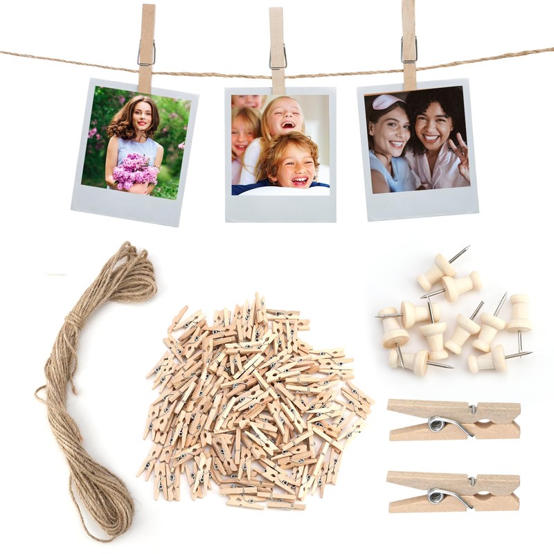 - Package Content: You will get 150pcs mini wooden picture pegs, 1 pcs of 10 meters picture hanging string and 10 picture pins. The length of the photo clips are about 2.5cm. Whether you want to hang photos or make handmade decorations, you can do it here!
