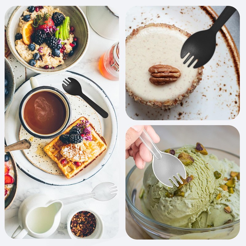 • Versatile 2-in-1 Design: These mini sporks combine the functionality of both a fork and spoon in a single utensil, making them perfect for eating a variety of foods like yogurt, ice cream, fruit, and small desserts.