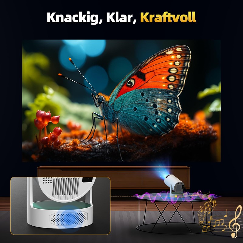 • Auto keystone and manual focusing: This 4K projector small projector has automatic vertical keystone correction and is equipped with a 270° rotating base, so it can be installed anywhere - on the wall, ceiling or even on the go. Its versatility makes it the ideal choice for indoor and outdoor projections. The focus can be adjusted manually to ensure a sharp image depending on the setup.