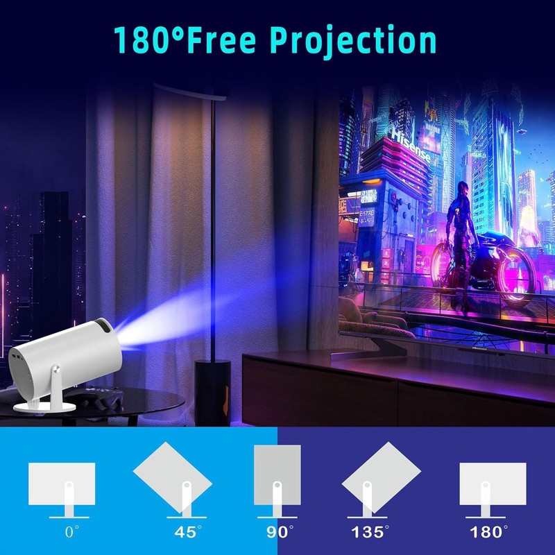 The mini projector features auto keystone correction for fast correction of the projector screen, and manual focus adjustment for crystal-clear visuals. With 180° versatile rotation capability, it effortlessly adapts to any projection surface - walls, ceilings or floors - delivering perfect viewing angles in any environment