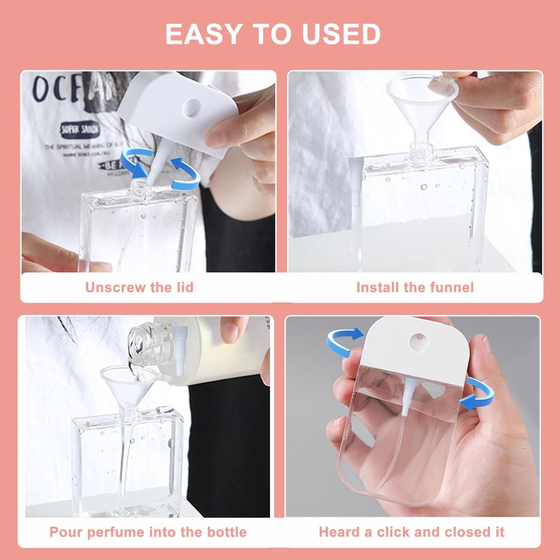 - Easy Refill with Removable Inner Bottle:Twist the nozzle, pull out the inner card spray bottle (5.2cm x 10.2cm), and use the included wide-mouth funnel for mess-free refills. No droppers/pumps needed! Works with perfume, sanitizer
