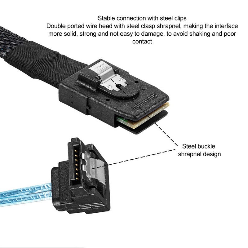 1、SAS CONNECTION SYSTEM: SAS is a point to point connection storage system, which is a smaller, more resilient serial design connection system that replaces SCSI. 2、FAST TRANSFER SPEED: SAS connectors allow devices to be connected via cable or directly to the backplane. Data transfer speeds of up to 12GBPS can be achieved. 3、TINNED COPPER CORE: Mini SAS SFF to 4 SATA 7Pin cable uses thicker and higher purity tinned copper core with aluminum foil shield to greatly improve data transfer efficiency and speed, while reducing heat loss. 4、DUAL CHANNEL: Mini SAS SFF to 4 SATA 7Pin data cable uses a dual channel aluminum foil cable for faster and more efficient data transfer, and a slim, flexible, pull resistant cable that can be flexibly placed in any corner. 5、EXCELLENT CONDUCTION PERFORMANCE: The seven contacts are gold plated with pure copper, wear resistant and anti corrosive, enhancing the quality of signal transmission and longer service life.