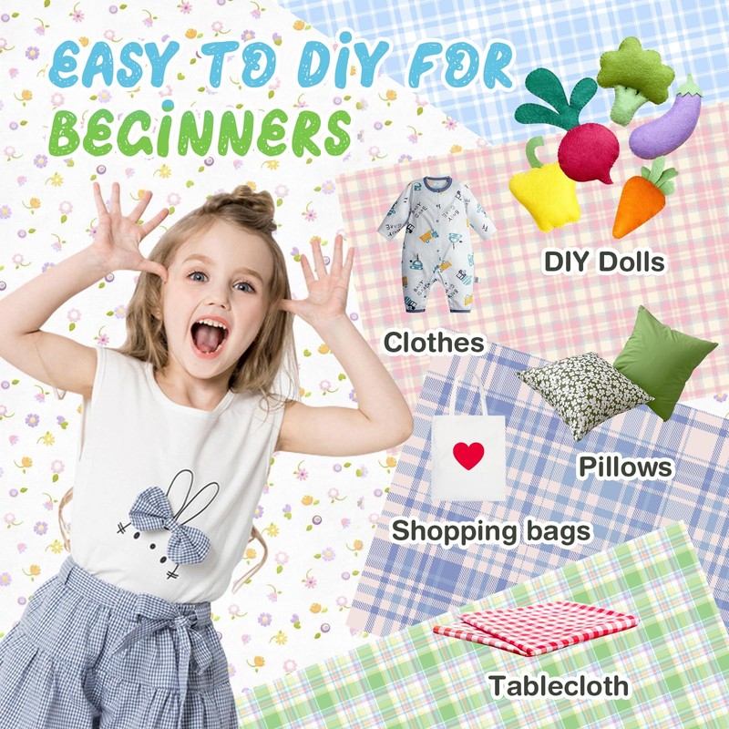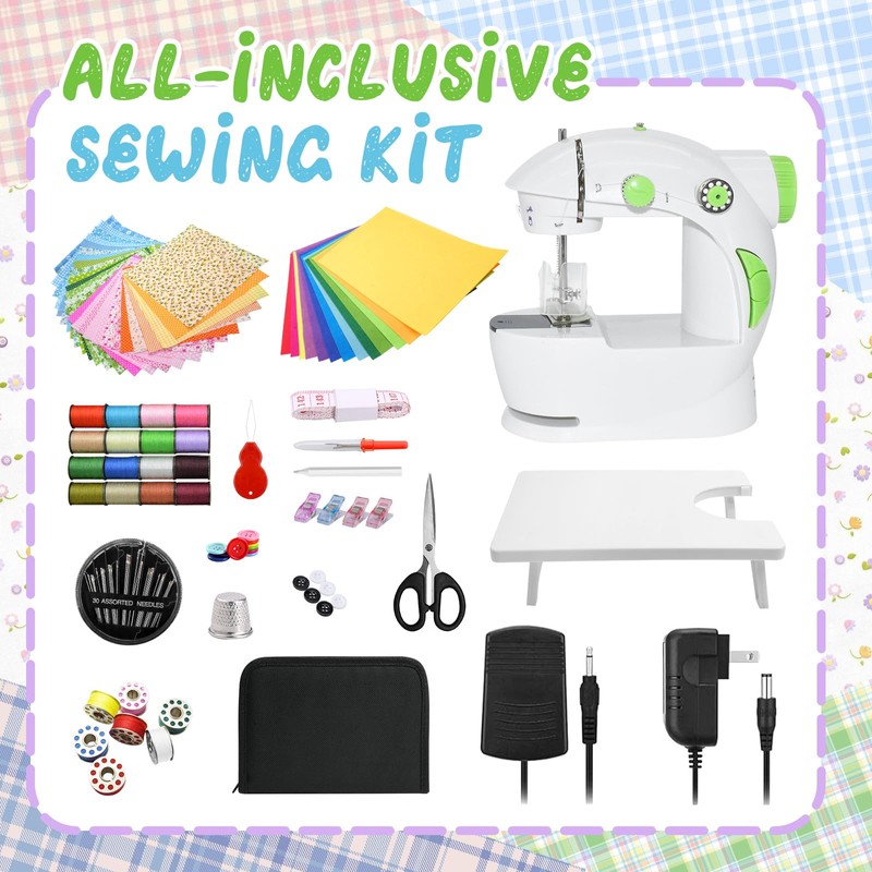 - Children Sewing Machine Kit—Mini sewing machine kit includes small sewing machine, 50 pieces of 10” x 10” fabric, 16 threaded bobbins, 4 spare bobbins, 5 sewing machine needles, 16 spools of thread, 10 sewing clips, thimble, needle threader, seam ripper, scissors, tape measure, chalk pencil, foldable 12” ruler, & guide book.