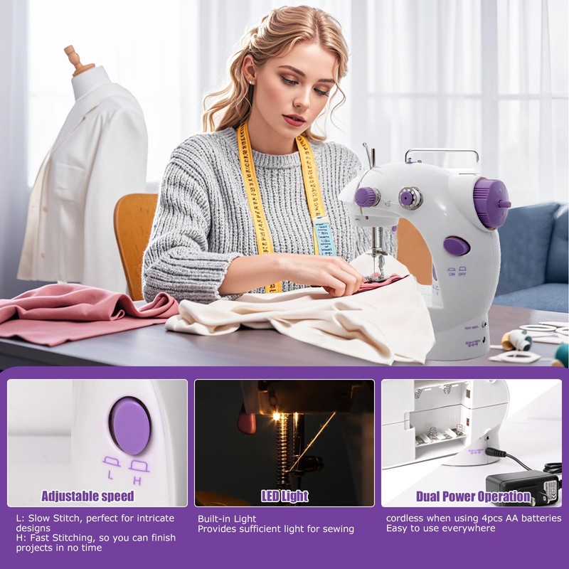 • 【Flexible Power and built-in Light】 This mini sewing machine offers battery (4 AA batteries required) and plug-in options. Its compact size and lightweight design make it easy to carry and store. Plus, the built-in security light provides clear visibility even in low light, making it ideal for daily sewing tasks, suitable for sewing for kids ages 8-12, or everyday family sewing needs.