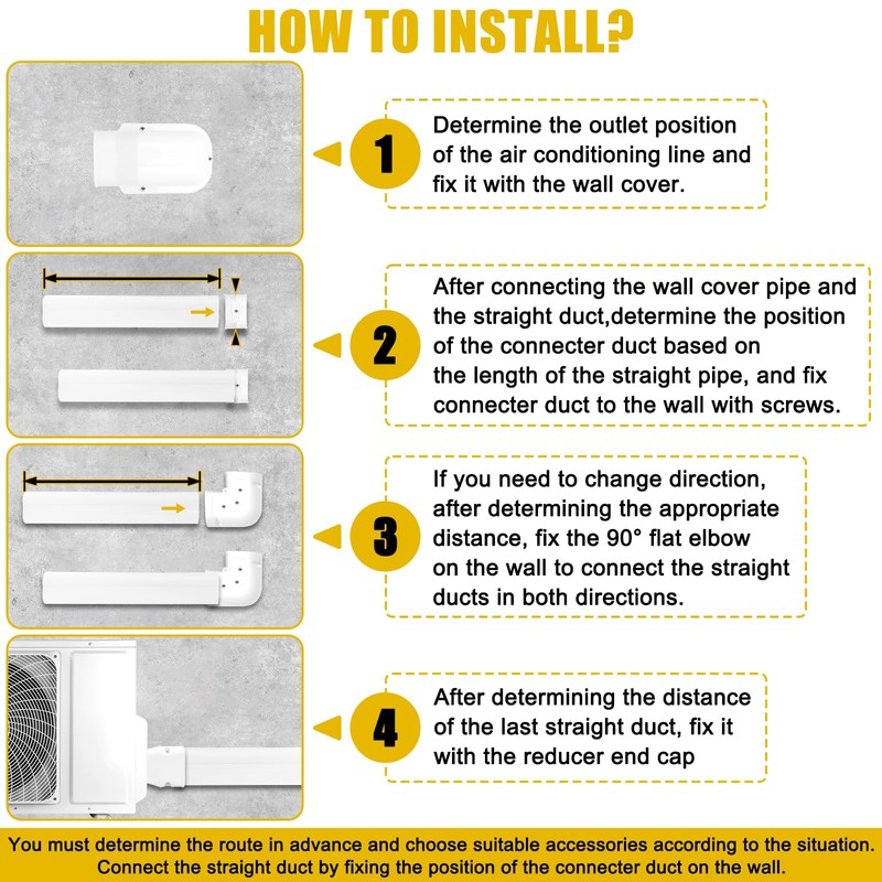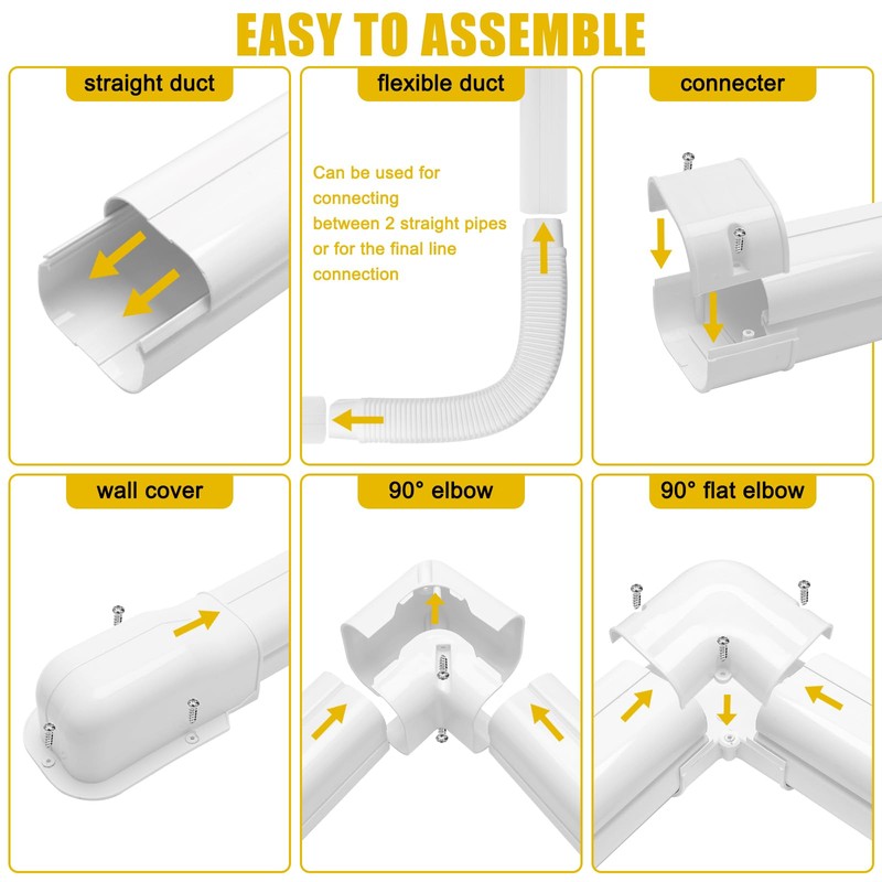 - PACKAGE INCLUDE: mini split line set cover include 5 pcs straight mini split wall cover, 4 pcs connecter ducts, 1 pcs flexible duct, 1 pcs wall cover, 1 pcs reducer end cap, 1 pcs 90° elbow, 1 pcs 90° flat elbow.