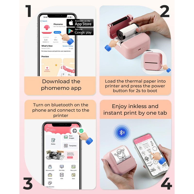 - Easy to Using: 1.Download the APP at APP store. 2.Open the Bluetooth. 3.Select the M02L mini printer and connect it ( you can also double-click the power button of the printer and use the App to scan the OR code above)