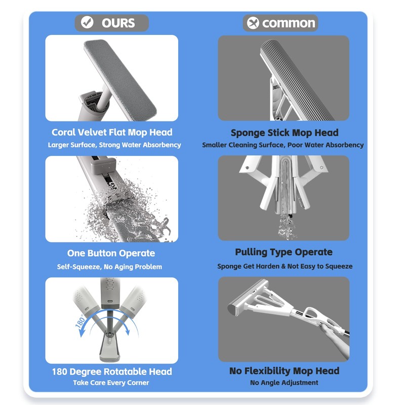 - En comparación con la fregona de cabeza de esponja normal, el cabezal de fregona de forma plana y rectangular con mecanismo giratorio flexible es más fácil de usar para cuidar cada esquina de cada esquina