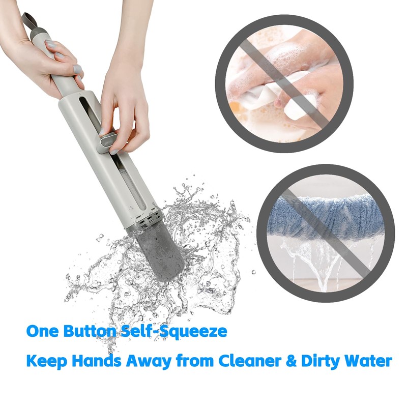 - Con un botón hacia arriba y hacia abajo, aprieta la fregona de terciopelo de limpieza y límpiala sin mojar tus manos. Mantén tus bonitas manos alejadas del agua limpia y sucia.