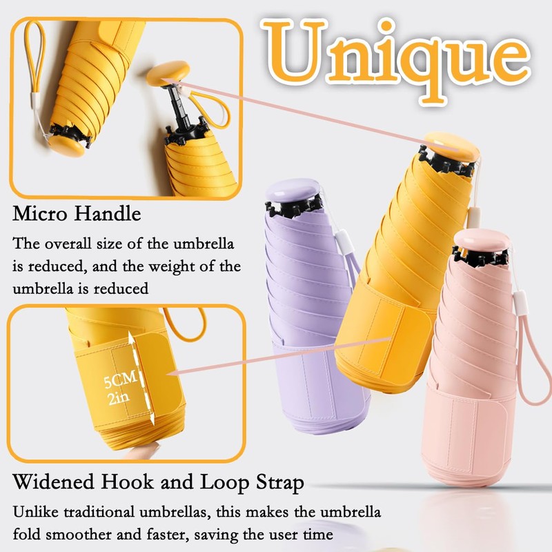 Mini Travel Folding Umbrella with Micro Button Handle&5cm/2IN Hook and Loop Strip for Women Men Kids-Portable Compact Lightweight Small,6 Ribs,UV Protection,Teflon Coating,Rain Sun,Handbag,Pocket