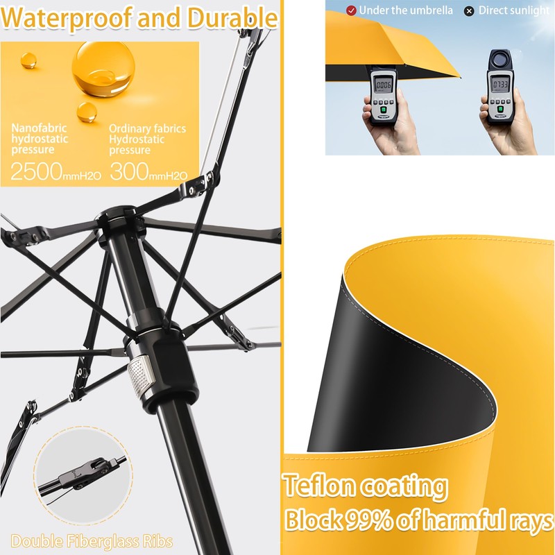 - High-quality umbrella cloth, durable ribs: The umbrella surface is made of high-density waterproof fabric and nano-level waterproof technology, which can withstand 2500mmH20 hydrostatic pressure, and quickly slides off when it encounters water, keeping you dry. 6 high-toughness fiberglass ribs are light, strong, rust-proof and durable. Whether at home, in the office or in the car, you can prepare one, because whether it is sunny or rainy, this umbrella can protect you from wind and rain