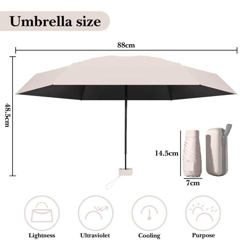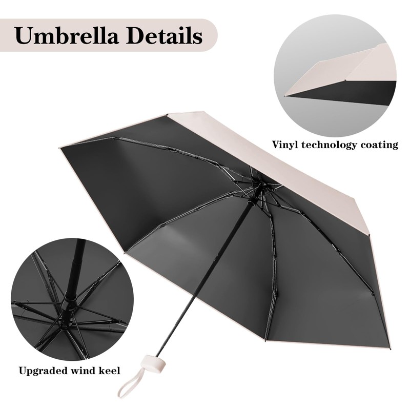 - Efficient sun protection: the mini travel umbrella can effectively block ultraviolet rays and prevent browning. By using a high-quality black glue or coloured adhesive coating, it can block 95% of ultraviolet rays and other harmful sun rays and has a high sun protection index to protect your skin from sun damage.