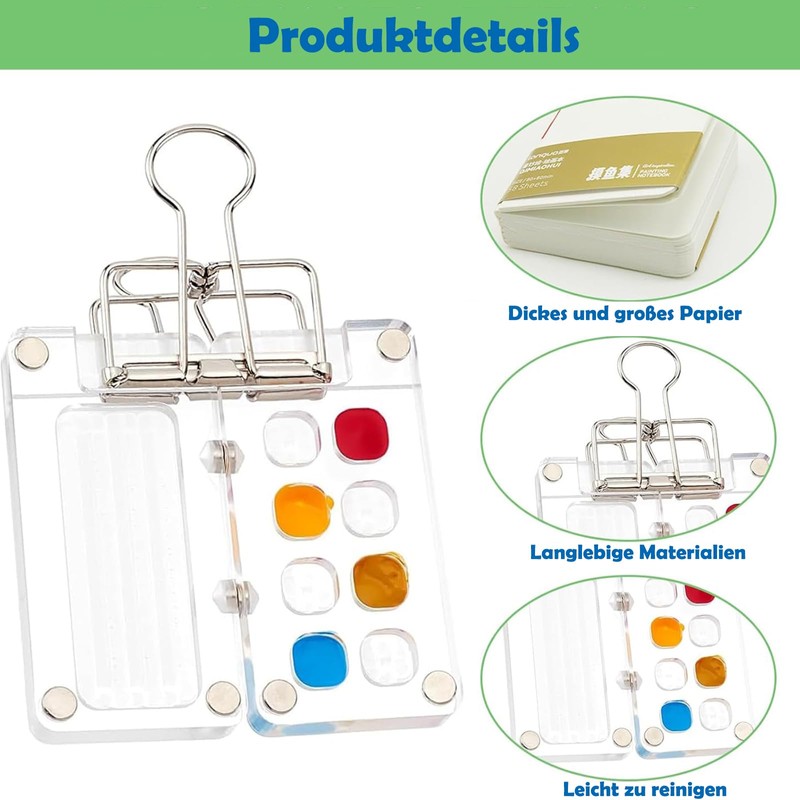 - High-quality materials: the portable mini watercolour box with a clip that is attached to the sketchbook. It is made of high-quality materials, is robust, durable and the oil impregnation protects against water.