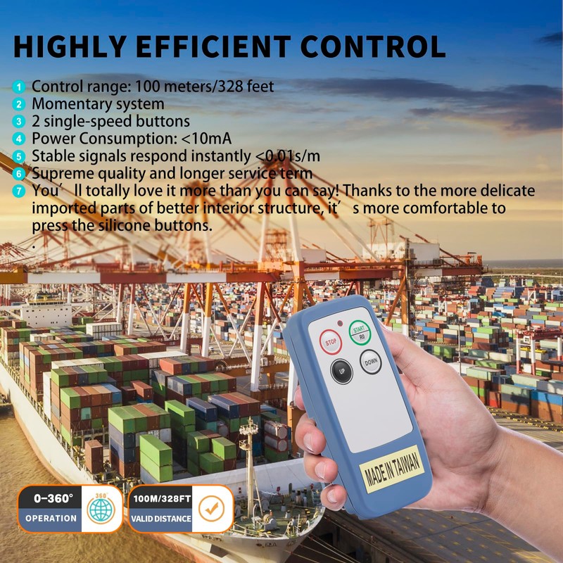 - ✯【Application】: Not just for cranes. You could use the wireless chain hoist remote control as a remote momentary switch for anything 110V. This universal hoist crane remote control is widely applicable for Winch, Lifting, Chain Hoist, Tow Bed Truck Crane, Dump Trailer, Mobile Truck Crane,Bridge Crane, Gantry crane, Mobile Lifting, and other industrial remote control applications with a hook, CD, or electric hoist.