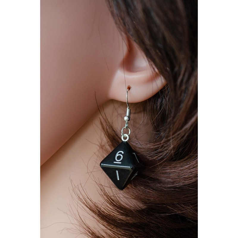 - Funny play cube earrings made from original 80s octahedron backgammon dice. A fun gift or accessory for game nights. - Pendant material: high-quality synthetic resin - Hook and eyelet: metal, silver-plated Length of the pendant (without hook): 30 mm Box contents: 1 pair of earrings
