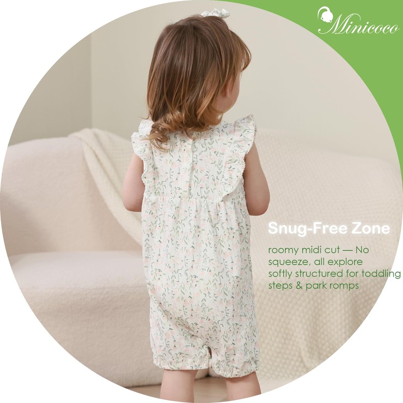 • HIGH-QUALITY FABRIC - This baby girl summer romper is made of 100% pure cotton. The natural fibers used in the material are gentler, less likely to irritate the skin, and have low allergenicity, effectively protecting the skin health of allergic babies. Meanwhile, the fabric is very soft, with good moisture absorption and breathability, reducing the risk of overheating and ensuring warmth and comfort.