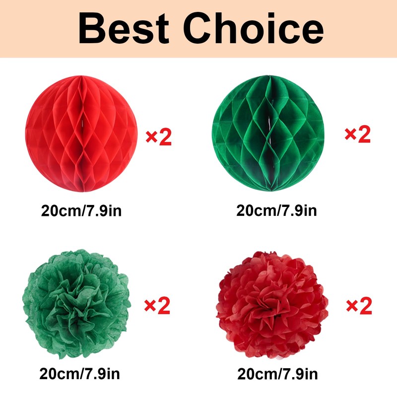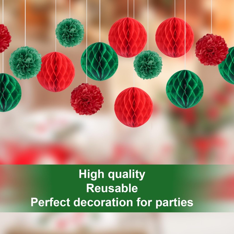 - Christmas Decoration Set - Minicoco Christmas party decoration set has 8 pieces of red and green honeycomb balls and paper pom poms to meet a variety of decorative needs and add a sense of Christmas party atmosphere.
