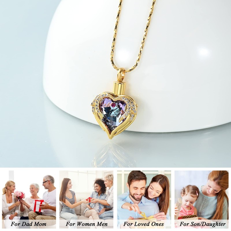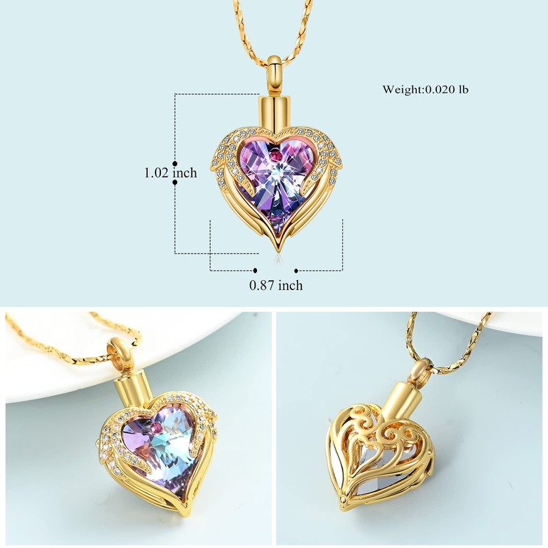 Minicremation Stainless Steel Urn Necklace Angel Wing Heart Pendant for Ashes for Women Memorial Human Ashes, Stainless steel zirconia stone, Zircon Diamond Amber