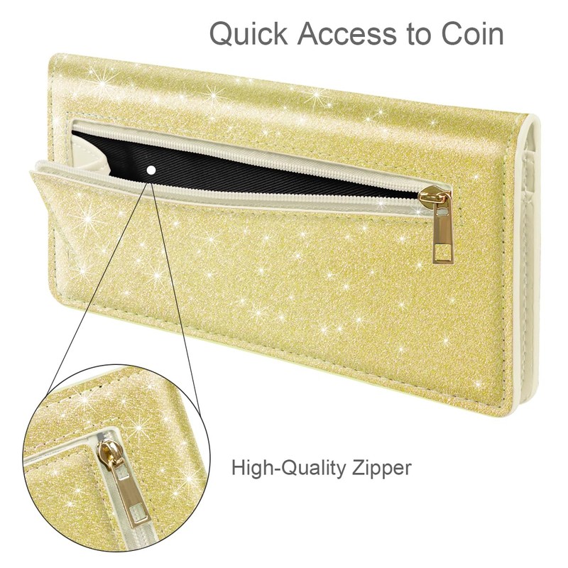 - 【Smooth Glitter Leather Wallet】: Our womens wallet is made of high quality smooth gold glitter leather on the out side and it never fade away, use the premium oil leather inside. Each card slot is stitched and checked for imperfections. Smooth,sparkling,bright,wear-resistant and top workmanship.