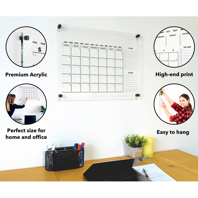 - TRACK YOUR SCHEDULE - Keep your schedule in clear view with our acrylic dry erase calendar. It’s not just good-looking; it’s also a practical tool for jotting down your daily plans and reminders, always keeping them in sight.