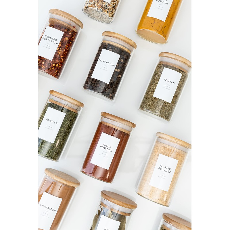 - SPICE DRAWER ORGANIZATION - 146 Preprinted Spice Jar Labels suitable for Bamboo Jars and Round or Rectangle Glass Spice Jars Sets, positioned vertically