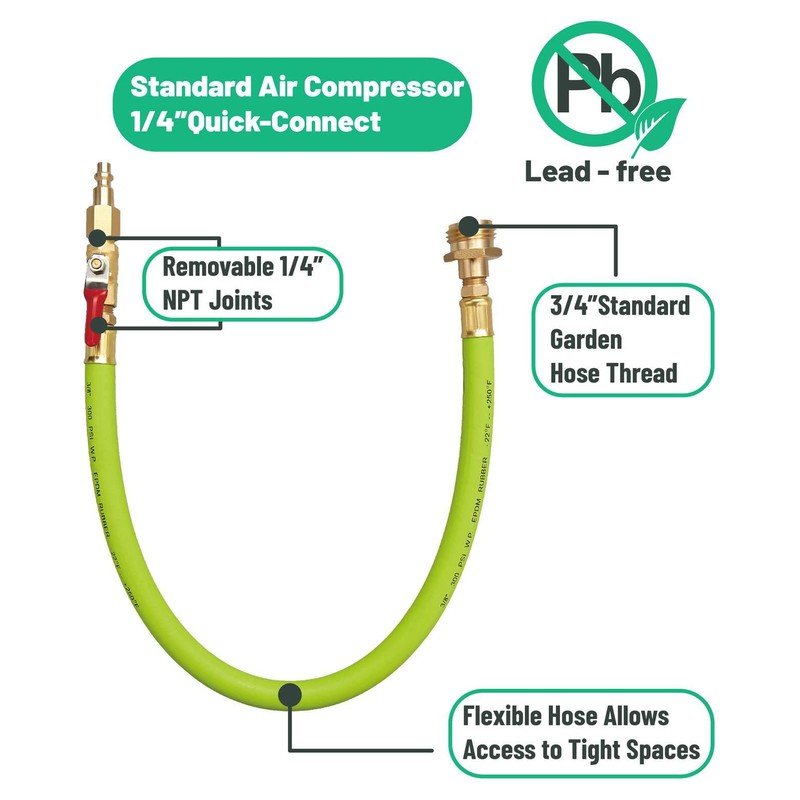 • ★ Flexible hose allows the adapter to access tight spaces and minimizes stress on pipes and fittings. Easily connects to air compressor and garden faucet to winterize lawn sprinkler systems, faucets, and plumbing to prevent damage due to freezing. Compatible with standard garden hose threading and air compressor quick-connect commonly found in North America.